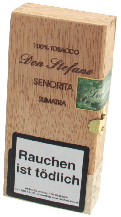 Mit der Don Stefano Zigarillos – Senorita Sumatra greift man zu einem maschinell gefertigten Shortfiller, der als Deckblatt ein edles Sumatra trägt. Ergänzt wird es durch ein Umblatt aus Java und einem komplexen, aber miteinander harmonisierenden Einlagenblend aus brasilianischem und indonesischem Tabak. Das Resultat ist eine ausbalancierte, fein wirkende Würze mit einigen anregenden Noten. Vielraucher werden hier ebenso auf ihre Kosten kommen wie preisbewusste Gelegenheitsraucher. Zur Auswahl steht eine 25er-Kiste oder eine 10er-Kiste.